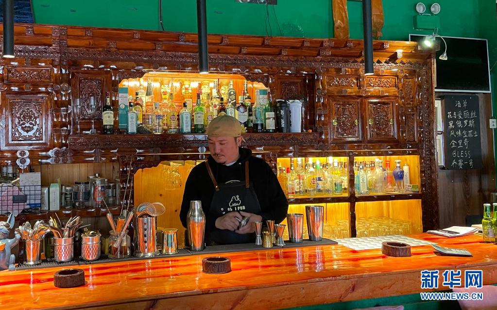才仁俄賽在餐廳調酒(4月12日攝,手機照片)。新華社記者 劉江 攝