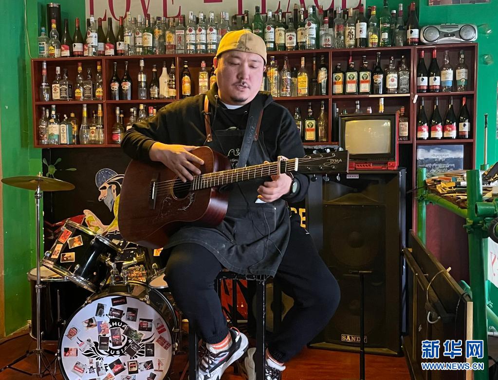 才仁俄賽在餐廳創作音樂(4月12日攝,手機照片)。新華社記者 劉江 攝