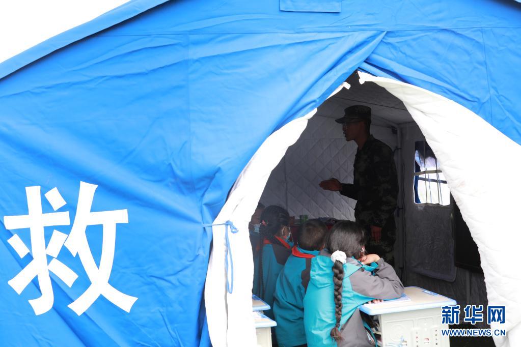 5月24日,武警青海總隊果洛支隊機動大隊排長張國睿為花石峽鎮(zhèn)藏文中心寄宿制小學的孩子上課。新華社記者 劉芳 攝