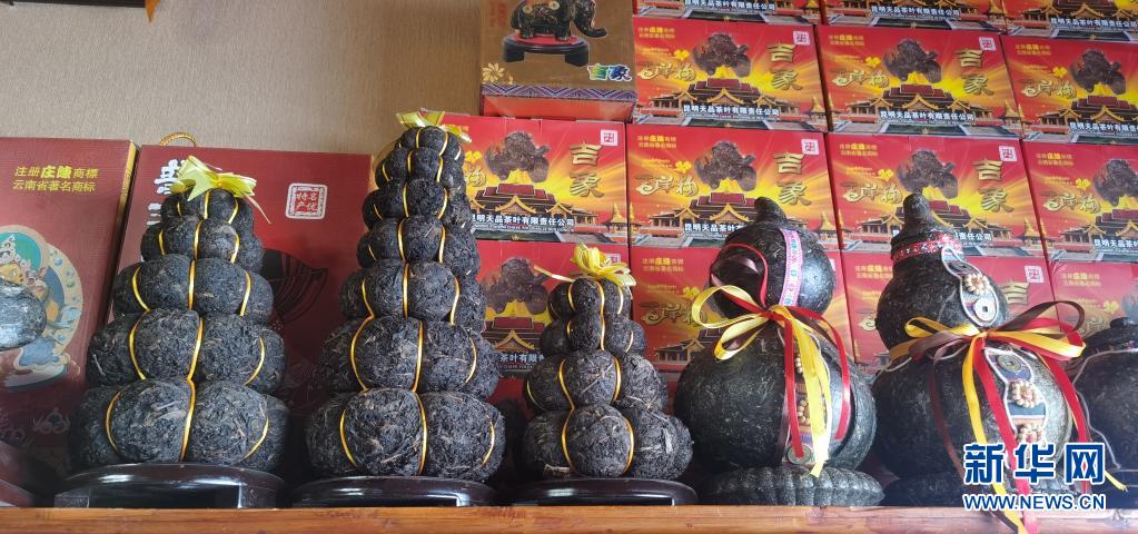 在位于西藏拉薩的一家茶葉公司的門店內擺放著造型獨特的茶葉制品(4月23日攝)。新華社記者 張京品 攝