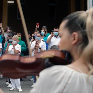 當(dāng)日,羅馬尼亞首都布加勒斯特一個樂隊在該國一家傳染病醫(yī)院——馬太·巴爾什醫(yī)院演出,向抗擊新冠疫情的醫(yī)務(wù)工作者致謝。