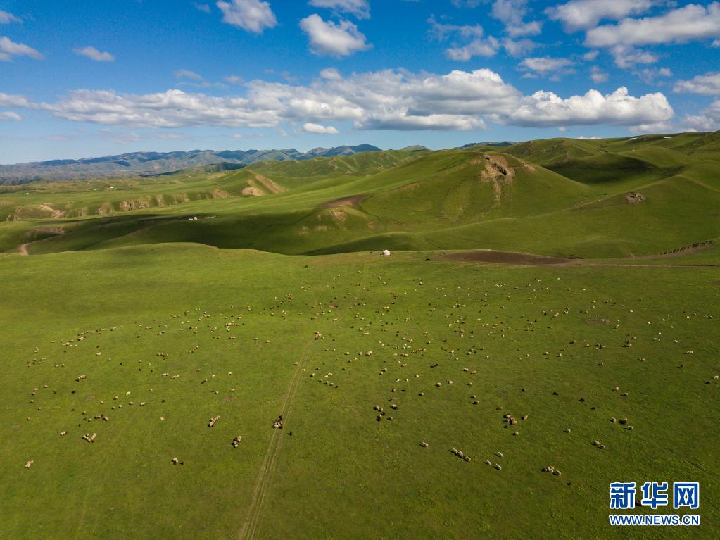 新疆裕民縣巴爾魯克山區(qū)夏牧場上的牛羊、氈房(6月15日攝,無人機照片)。