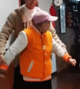 悄悄站在奶奶身后抓着手臂一同跳舞