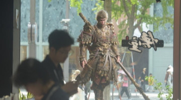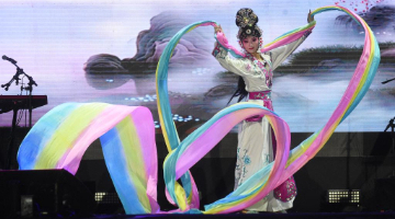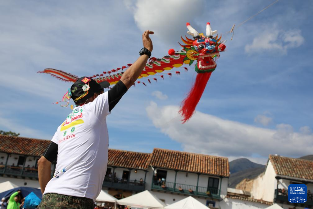 8月17日,在哥伦比亚莱瓦,工作人员向空中飘过的中国龙头风筝挥手。