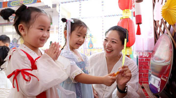 9月8日,在河北省遵化市新华书店举行的儿童迎中秋主题活动中,工作人员和小朋友一起做灯笼。