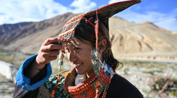 9月13日,工作人员身着传统服饰在塘栖古镇的广济桥上参加古风主题巡游。