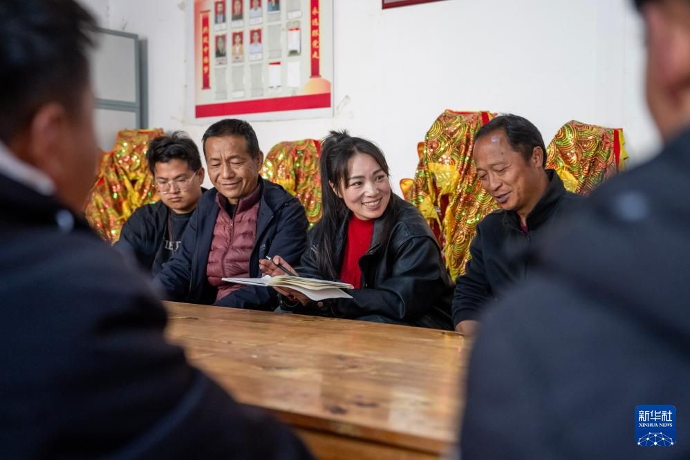 鲁丽华(中)在南涧彝族自治县公郎镇落底河村布朗山寨调研布朗族群众文化生活(2025年2月17日摄)。