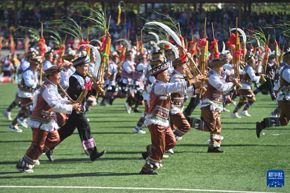 11月29日,表演者在融水县民族体育公园举行的芦笙斗马节开幕式现场表演。