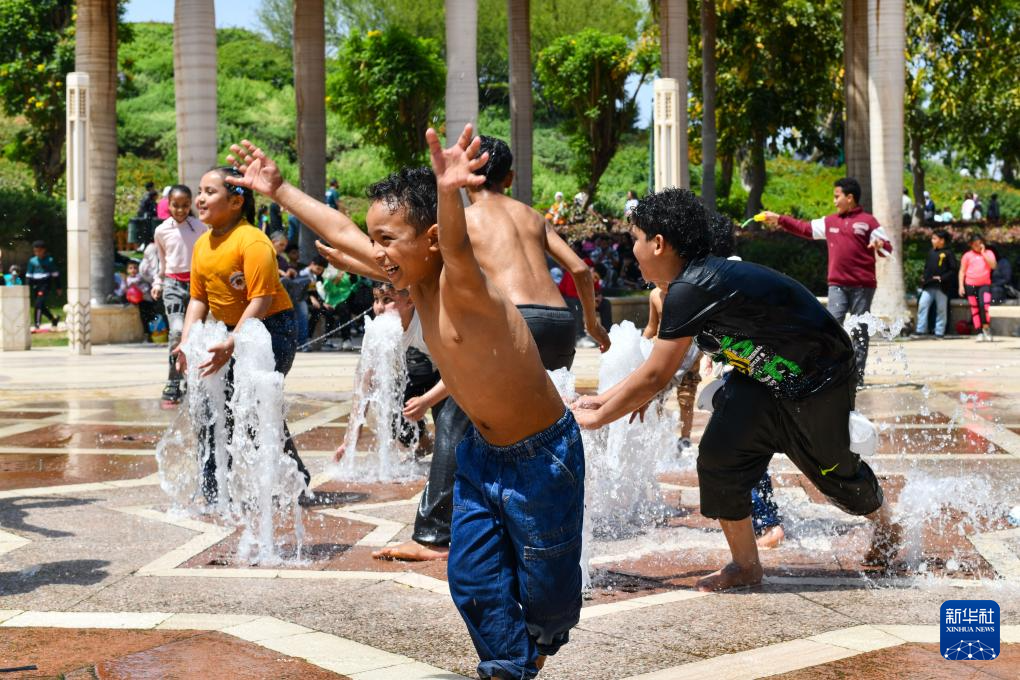 4月13日,儿童在埃及首都开罗的爱资哈尔公园玩耍。