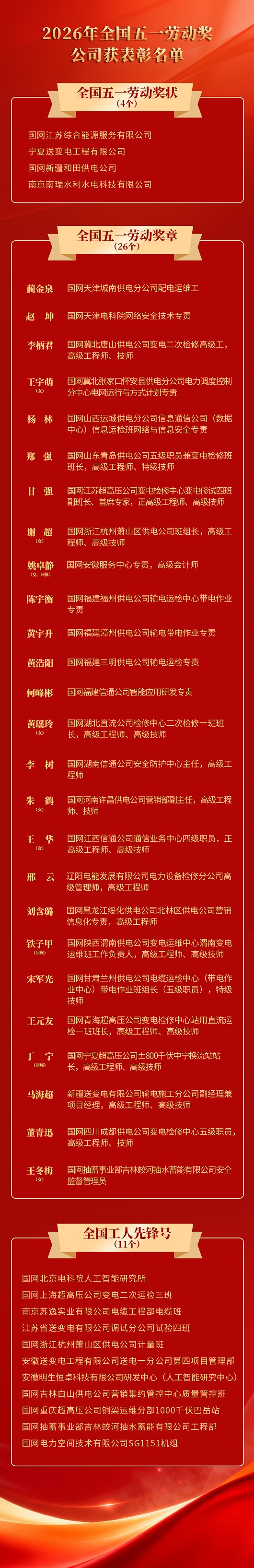国网江苏综合能源服务有限公司、宁夏送变电工程有限公司、国网新疆和田供电公司、南京南瑞水利水电科技有限公司4家单位获全国五一劳动奖状,来自电网生产运维、营销服务、工程建设、信息技术等岗位的26名个人获全国五一劳动奖章,国网北京电科院人工智能研究所、国网上海超高压公司变电二次运检三班等11个集体获全国工人先锋号。