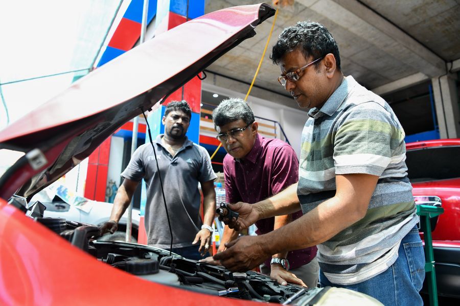 A car fixing company owner checks a car in Hulhule, Maldives, Sept. 1, 2019. (Photo by Du Cailiang/Xinhua)