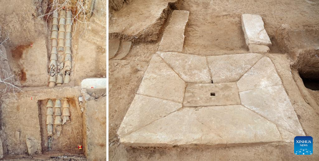 This combo file photo shows drainage facilities discovered from the Langya Terrace site in Qingdao, east China's Shandong Province. (Xinhua)