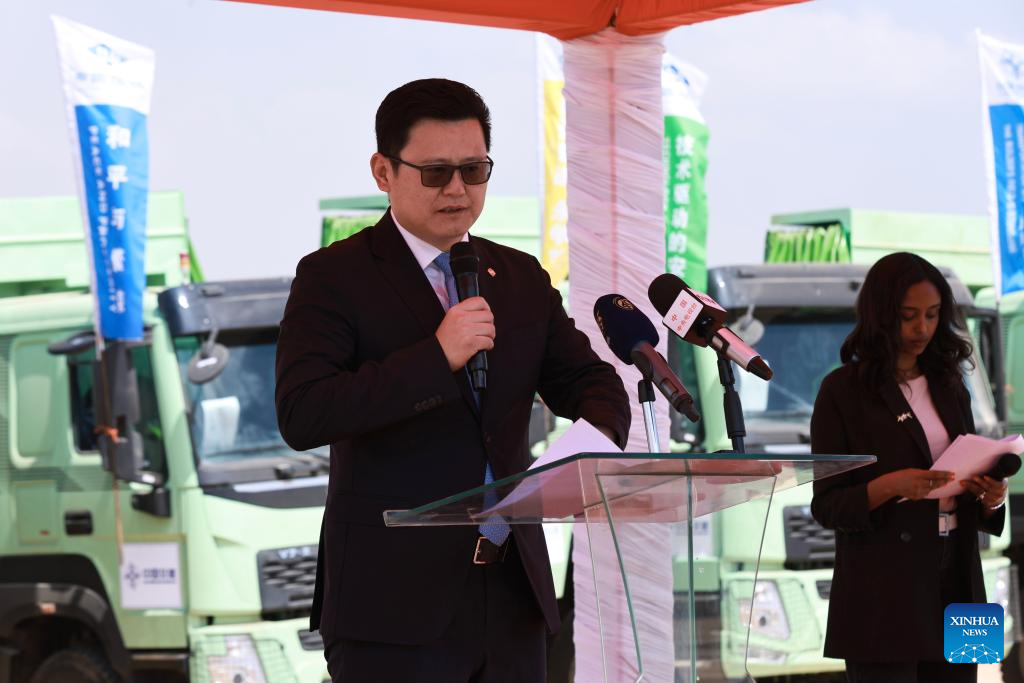 Wei Qiangyu, general manager of the CCCC Ethiopia Branch, speaks during the inauguration event at the construction site of the Bishoftu International Airport, near Bishoftu town in the Oromia regional state of Ethiopia, April 29, 2026. China Communications Construction Company (CCCC) on Wednesday introduced 50 electric heavy-duty trucks to Ethiopia's mega airport project site, promoting green mobility and development in the country's logistics and construction sectors. (Xinhua/Geng Xinning)