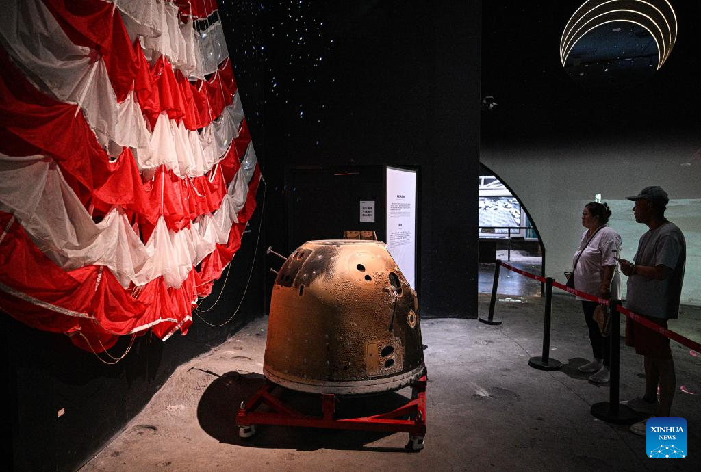 Visitors look at the parachute and return capsule of the Chang'e-5 probe at the Hainan Science and Technology Museum in Haikou, south China's Hainan Province, April 29, 2026. The Hainan Science and Technology Museum officially opened here on Wednesday. As a brand-new landmark for science popularization in the Hainan Free Trade Port, the museum boasts four exhibition halls with a total construction area of approximately 46,500 square meters. (Xinhua/Pu Xiaoxu)