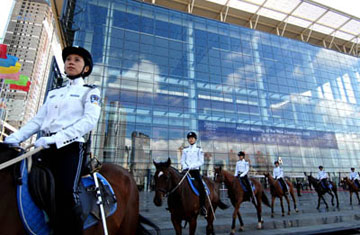 | Mounted policewomen secure Summer Davos | | Mounted policewomen patrol outside the Dalian World Expo Center, the venue of the Annual Meeting of the New Champions 2009, or Summer Davos, in Dalian, Sept. 12, 2009. |