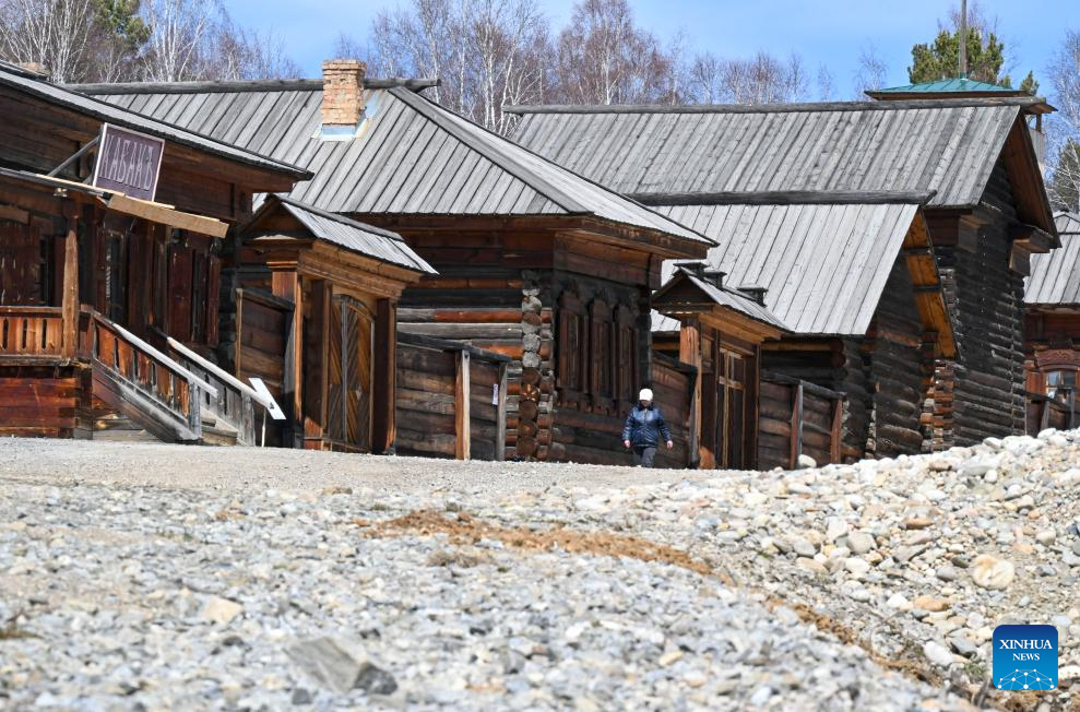 A tourist visits the Taltsy Architectural and Ethnographic Museum in Irkutsk, Russia, on April 28, 2026. (Xinhua/Hao Jianwei)