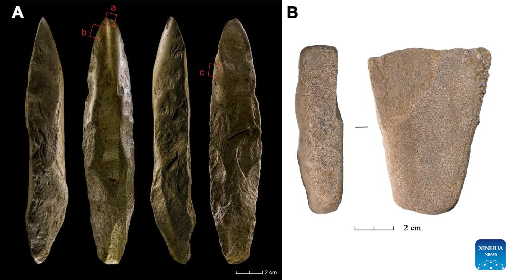 This combo file photo shows polished stone tools unearthed from the Dadong Paleolithic site in Helong City, one of the cluster of Paleolithic sites in the Changbai Mountains in northeast China's Jilin Province. (Xinhua)