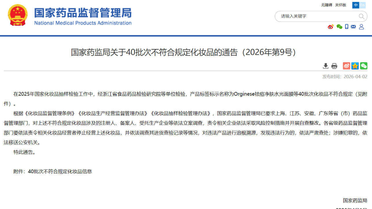 國家藥監局關于40批次不符合規定化妝品的通告(2026年第9號)