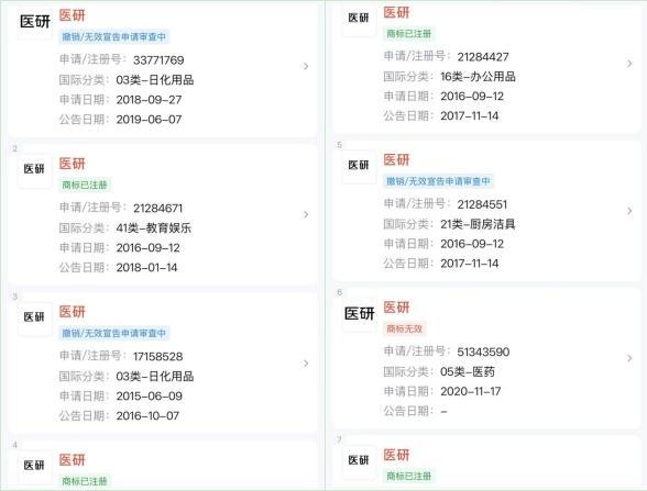 天眼查显示,登康口腔申请注册的“医研”商标覆盖多个国际分类。其中,国际分类为医药的“医研”商标被宣告无效,国际分类为日化用品的“医研”商标处于撤销/无效宣告申请审查中,国际分类为办公用品、材料加工、教育娱乐等的“医研”商标则已注册。