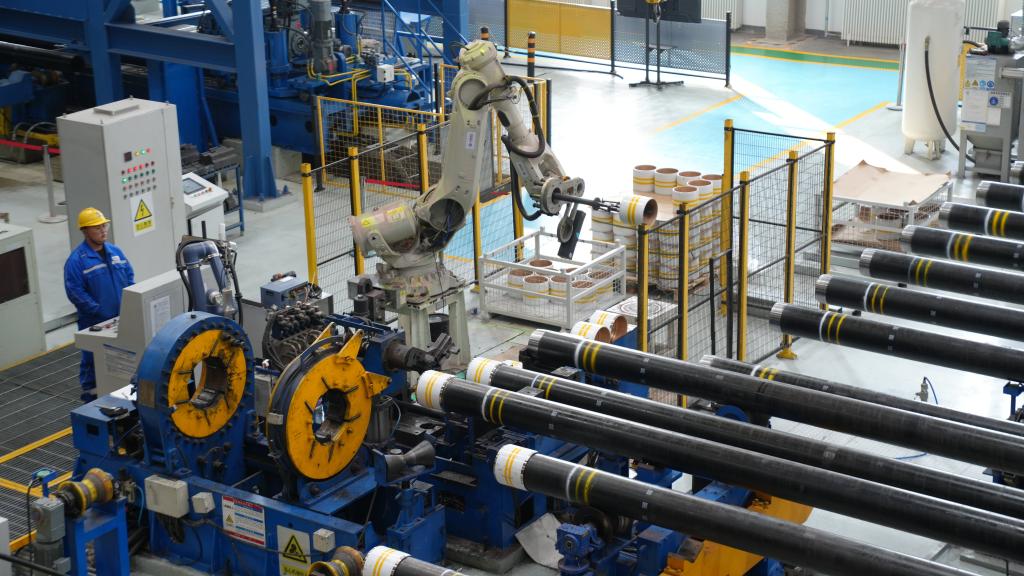 走近生产线,会发现每根油套管上都有一枚二维码。“油套管到达每个加工流程,机器会自动扫描,全流程实时追踪。”沈国华说,“约2万平方米的厂房,仅需6名工人紧盯屏幕、处理紧急突发情况即可完成全流程生产。”
