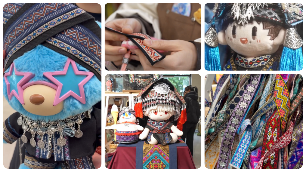记者在店内看到,专程前来的消费者不在少数。相比成品,亲手搭配的壮锦套装色彩更丰富、风格更个性,还能带着“娃”拍照打卡,留下专属回忆。工坊负责人介绍,每次有明星来南宁开演唱会,都会掀起一波IP娃娃的“娃衣”风潮。