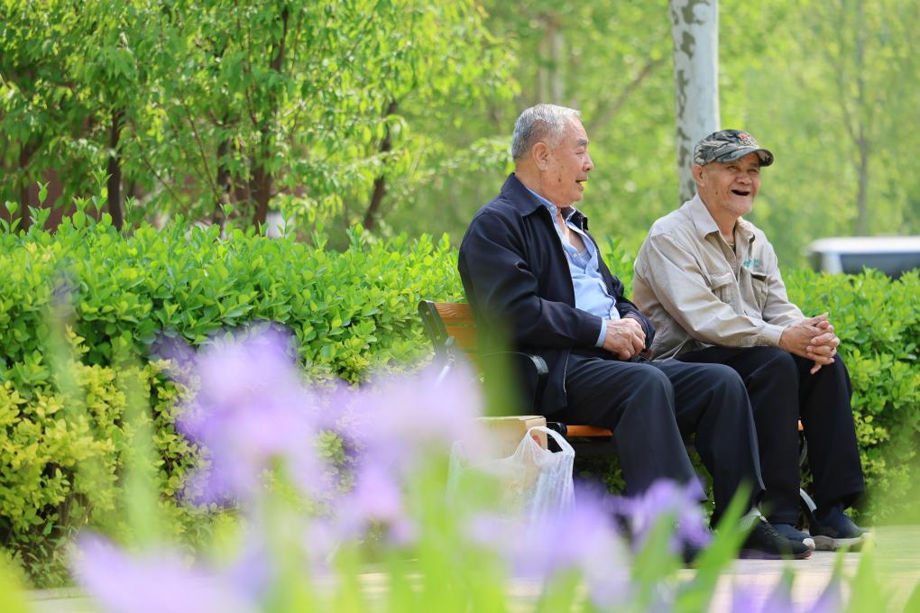 4月23日,在天津市滨海新区第一老年养护院,工作人员陪老人聊天。