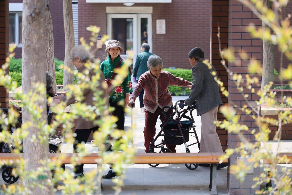 4月23日,老人在天津市滨海新区第一老年养护院内散步。