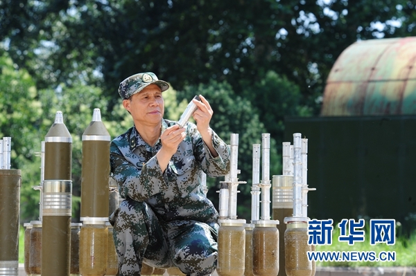中國工程院院士、軍事科學院國防工程研究院研究員任輝啟檢查彈體作用情況(資料照片)。 新華社發(侯藝兵 攝)