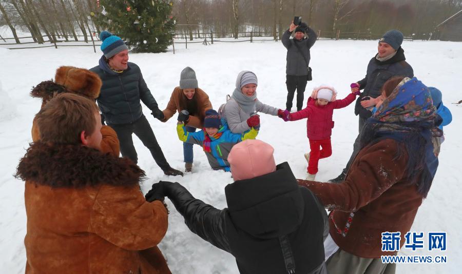 1月24日,人們?cè)诎锥砹_斯首都明斯克郊區(qū)的民族建筑博物館內(nèi)圍成圈跳舞。新華社發(fā)(任科夫攝)