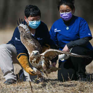 當日,北京猛禽救助中心在北京市延慶區野鴨湖濕地公園附近空地放飛了兩只康復治療后的大鵟。此次放飛的兩只大鵟在去年12月分別被市民發現,其中一只因饑餓、虛弱原因被救治,另一只因闖入市民鴿舍覓食被發現且身體有創傷被救治。經過三個月的治療,兩只大鵟均已康復并達到了放歸野外標準。北京猛禽救助中心的猛禽康復師為兩只大鵟佩戴了GPS追蹤器,以監測它們被放歸大自然后的情況。
