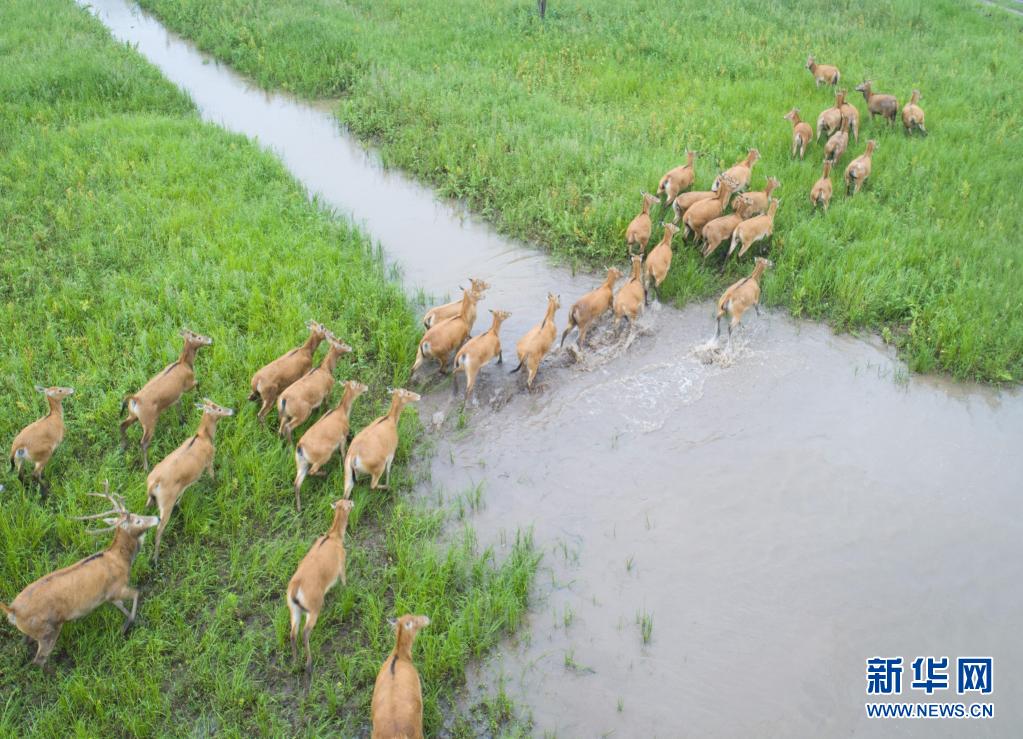 5月17日,一群麋鹿在石首麋鹿國(guó)家級(jí)自然保護(hù)區(qū)內(nèi)活動(dòng)(無人機(jī)照片)。新華社記者 肖藝九 攝