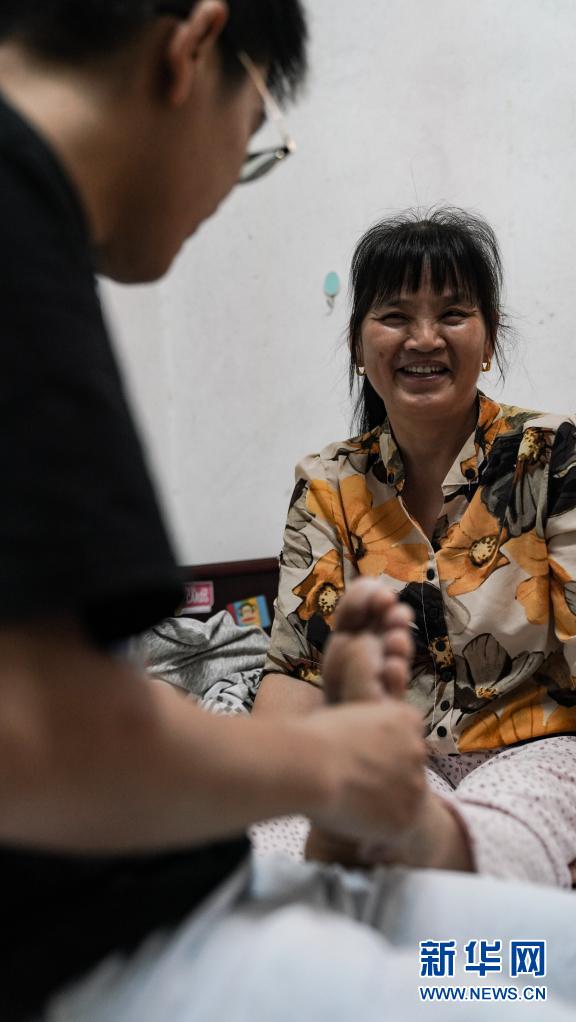 6月1日,趙建軍在宿舍內為母親按摩。新華社記者胡晨歡攝