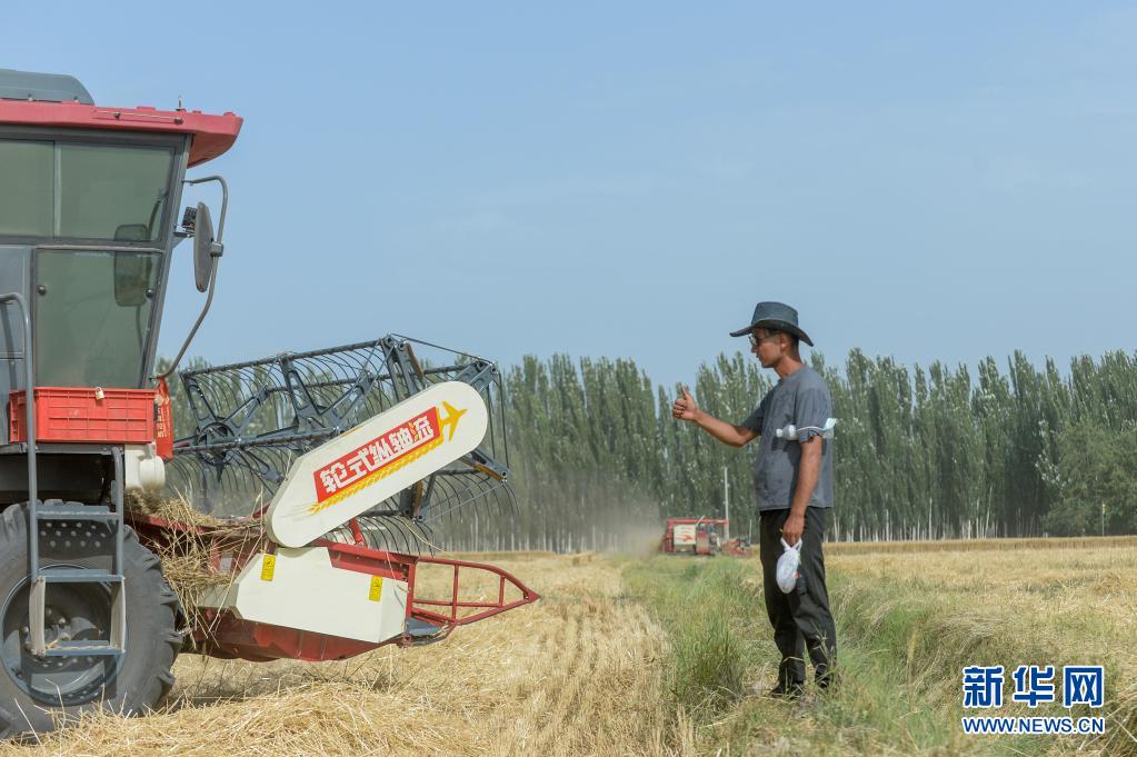 6月19日,麥客阿地力·沙拉木指揮聯(lián)合收割機進行作業(yè)。新華社記者 高晗 攝
