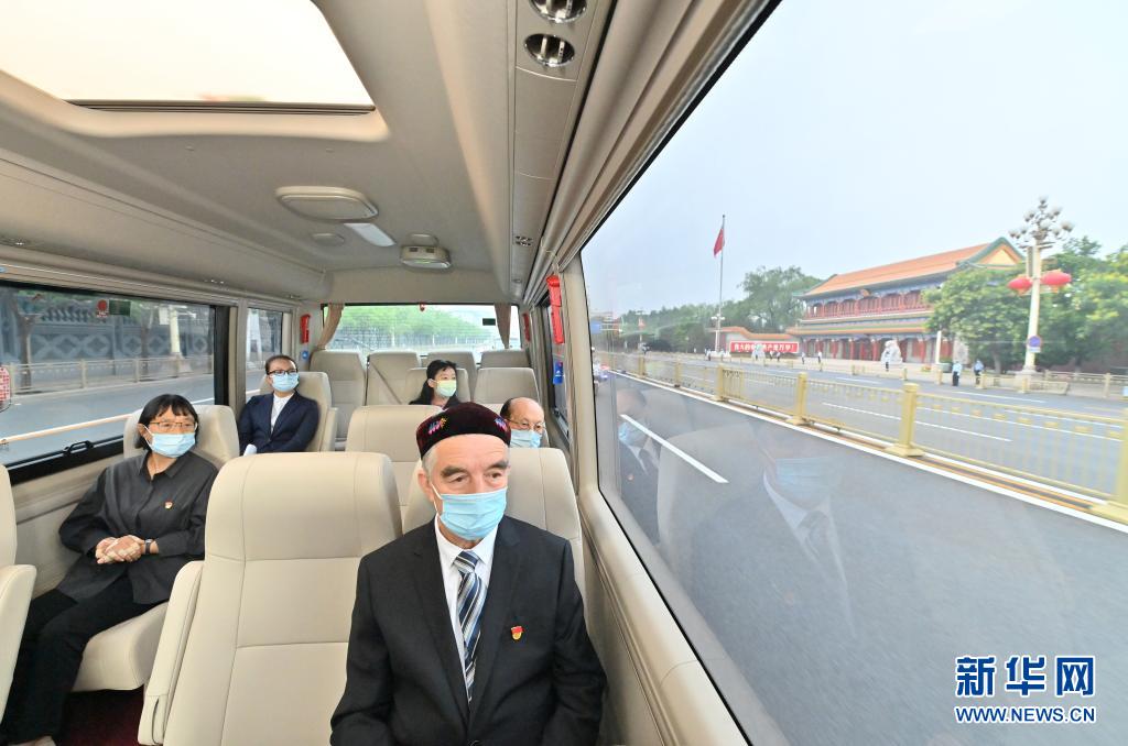 6月29日,慶祝中國共產黨成立100周年“七一勛章”頒授儀式在北京人民大會堂金色大廳隆重舉行。這是“七一勛章”獲得者買買提江·吾買爾(前)、張桂梅(左一)、吳天一(右一)乘坐禮賓車前往人民大會堂。新華社記者 岳月偉 攝