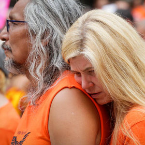 7月1日,抗議者在加拿大溫哥華舉行的集會活動上悼念遭到殘害的兒童。