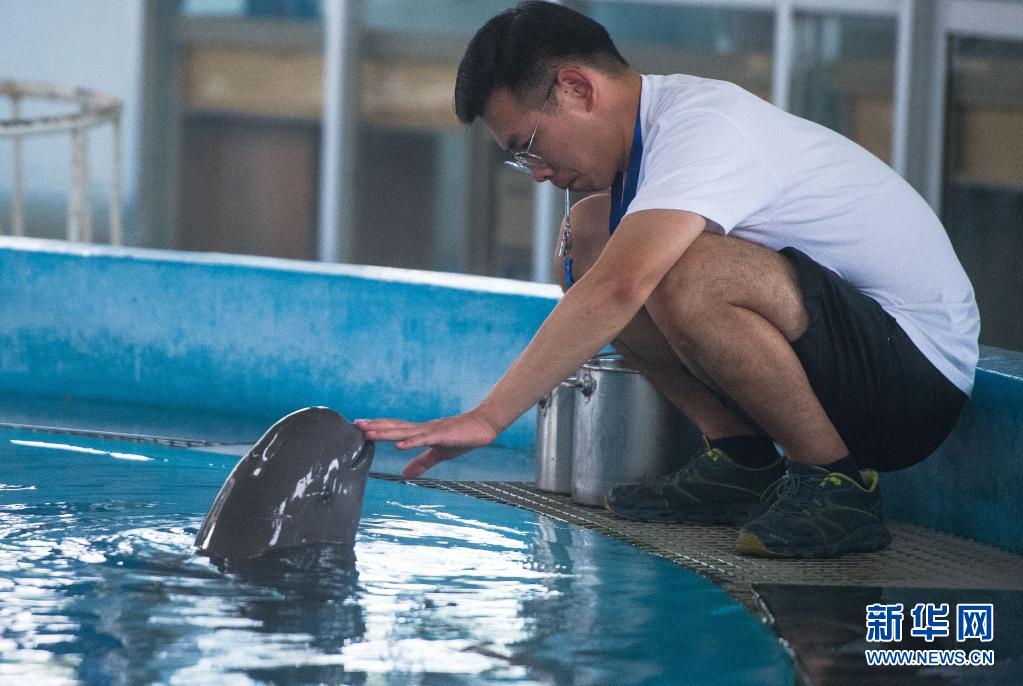 7月5日,中科院水生所白鱀豚館飼養(yǎng)員對(duì)長(zhǎng)江江豚進(jìn)行訓(xùn)練。新華社記者肖藝九攝