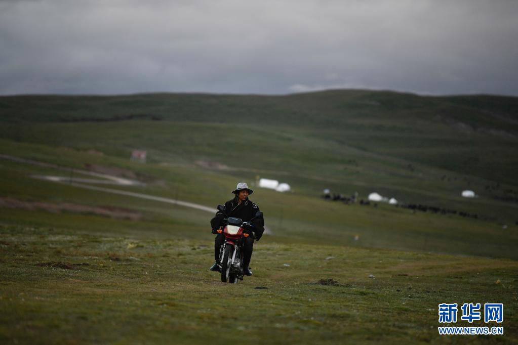 8月3日,在瑪沁縣當(dāng)洛鄉(xiāng)貢龍村的夏季草場(chǎng)上,牧民騎著摩托車在查看牛羊。