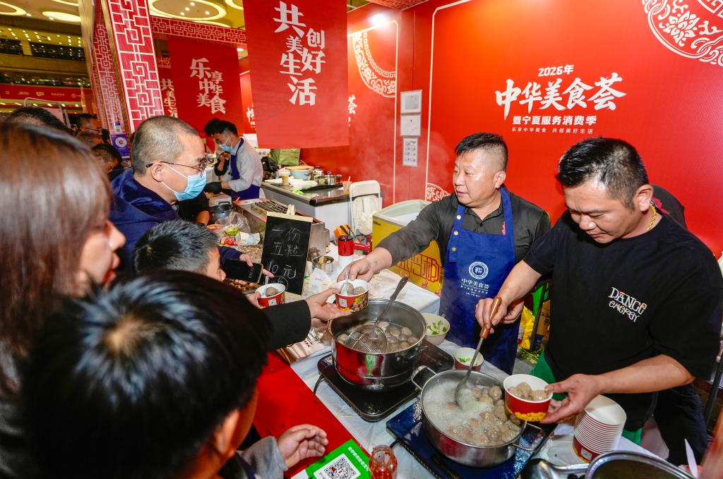 4月28日,在宁夏银川市,消费者在2026年“中华美食荟”活动现场购买潮汕牛肉丸。