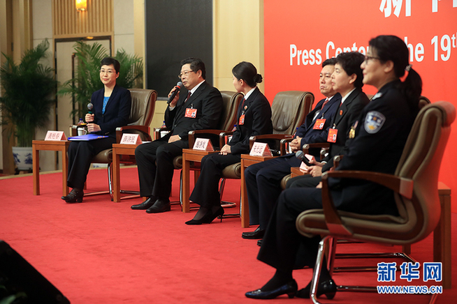 ??? 10月19日,十九大新聞中心舉辦集體采訪,邀請(qǐng)政法戰(zhàn)線代表談推進(jìn)全面依法治國(guó)。圖為采訪現(xiàn)場(chǎng)。新華網(wǎng) 郝廣鵬攝