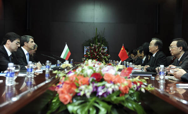 ??? 11月5日,中國(guó)國(guó)務(wù)院總理溫家寶在老撾首都萬(wàn)象會(huì)見(jiàn)出席第九屆亞歐首腦會(huì)議的保加利亞總統(tǒng)普列夫內(nèi)利耶夫。 新華社記者張鐸攝