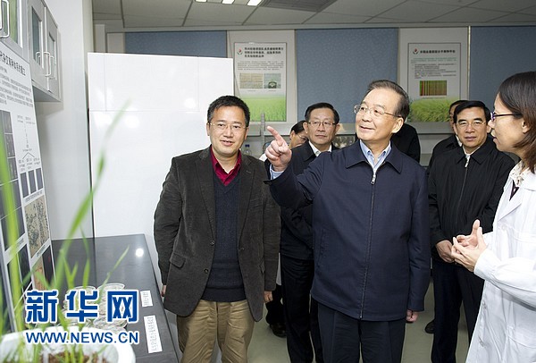 ??? 12月13日,國務院總理溫家寶到北京中關村考察并與部分企業負責人座談。這是溫家寶在未名凱拓農業生物技術有限公司考察。 新華社記者黃敬文 攝