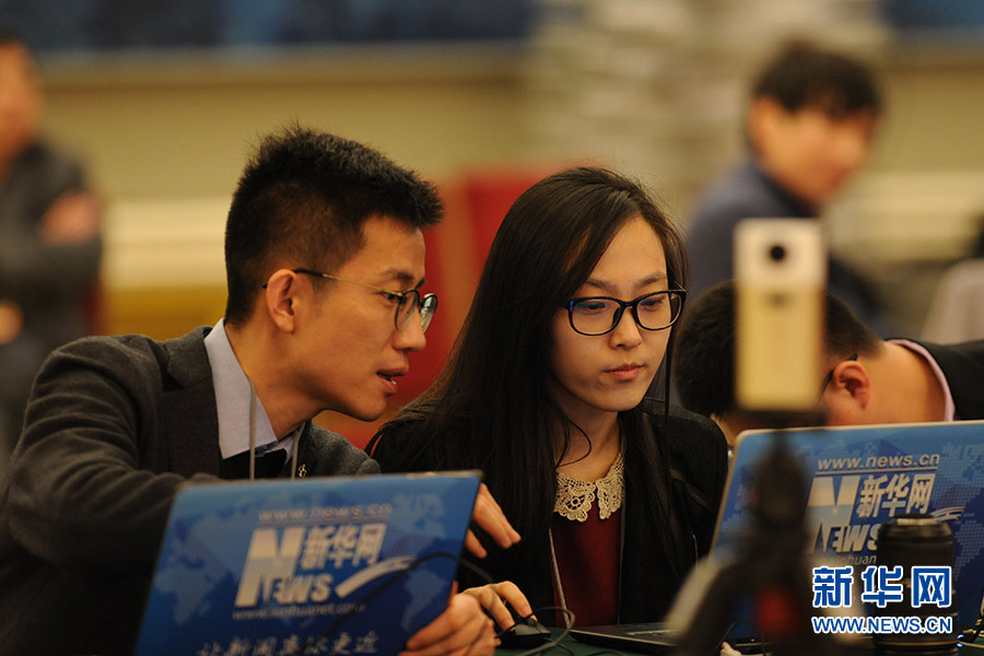 3月16日上午,國(guó)務(wù)院總理李克強(qiáng)在人民大會(huì)堂三樓金色大廳會(huì)見(jiàn)采訪十二屆全國(guó)人大四次會(huì)議的中外記者并回答記者提出的問(wèn)題。圖為新華網(wǎng)記者準(zhǔn)備總理記者會(huì)直播。新華網(wǎng)/中國(guó)政府網(wǎng) 陳杰攝