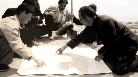 前圖為新華社2001年5月21日播發的新華社記者韓傳號拍攝的六老漢之一張潤元(右一)等人研究八步沙規劃圖;后圖為八步沙第二代治沙人研究八步沙地圖(新華社記者 范培珅 攝)。