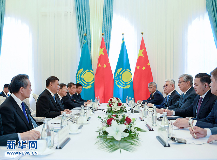 6月13日,國家主席習(xí)近平在比什凱克會見哈薩克斯坦總統(tǒng)托卡耶夫。 新華社記者 高潔 攝