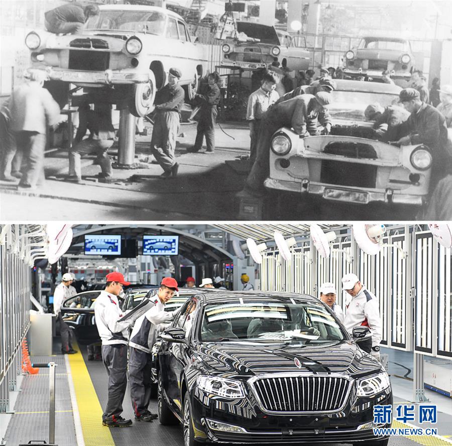 拼版照片:上圖為20世紀(jì)50年代拍攝的第一批紅旗轎車生產(chǎn)線(資料照片);下圖為在一汽紅旗總裝車間內(nèi),一汽紅旗職工在對(duì)生產(chǎn)的紅旗轎車進(jìn)行靜檢作業(yè)(新華社記者許暢2019年4月9日攝)。新華社發(fā)