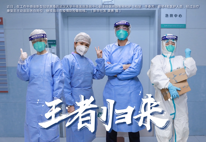 中南醫院急救中心副主任夏劍說,4名醫護人員工作中感染新型冠狀病毒,康復后不約而同重返崗位,這不僅體現了醫護人員無私奉獻精神,一定程度緩解科室醫護人員壓力,也向患者傳遞了戰勝疾病的信心。
