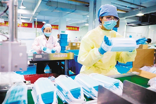 2月14日,浙江省長興縣和平鎮長興美迪康無紡布制品有限公司員工加緊生產口罩。 許 旭攝(中經視覺)