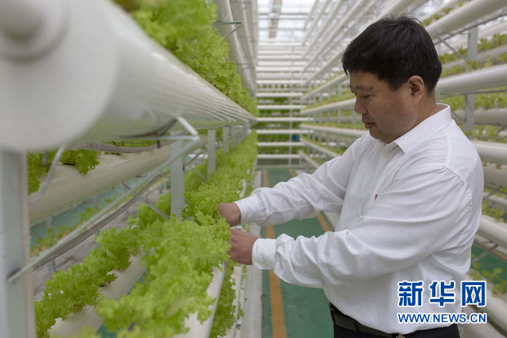 山東省蘭陵縣代村黨委書記王傳喜在查看無(wú)土栽培蔬菜長(zhǎng)勢(shì)(6月18日攝)。新華社記者王陽(yáng)攝