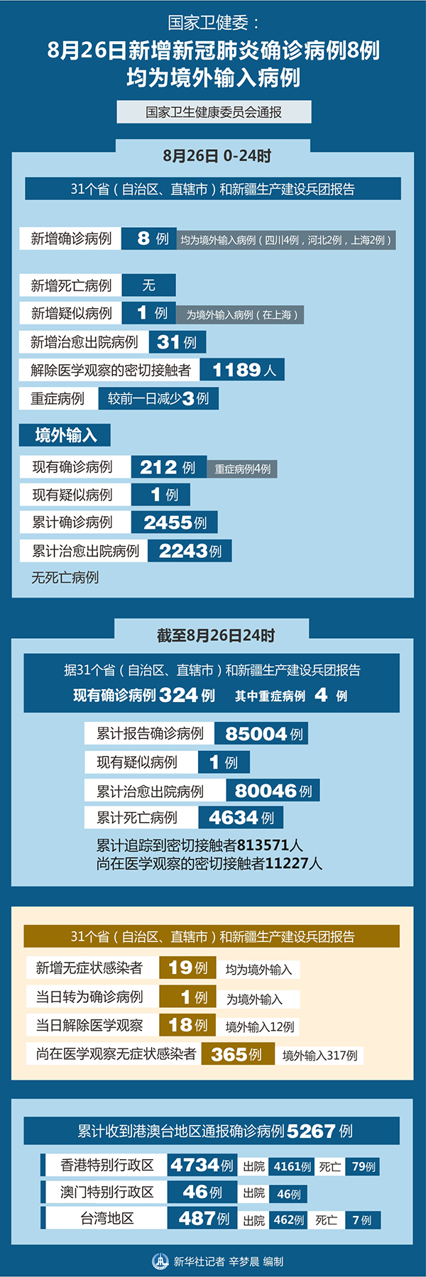 截至8月26日24時,據31個?。ㄗ灾螀^、直轄市)和新疆生產建設兵團報告,現有確診病例324例(其中重癥病例4例),累計治愈出院病例80046例,累計死亡病例4634例,累計報告確診病例85004例,現有疑似病例1例。累計追蹤到密切接觸者813571人,尚在醫學觀察的密切接觸者11227人。