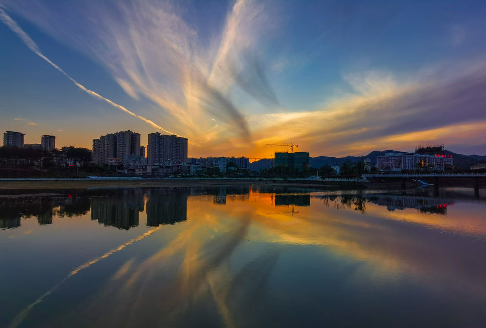 ?晚霞倒映在流經翁源縣城的滃江(4月27日攝)。新華社記者 劉大偉 攝